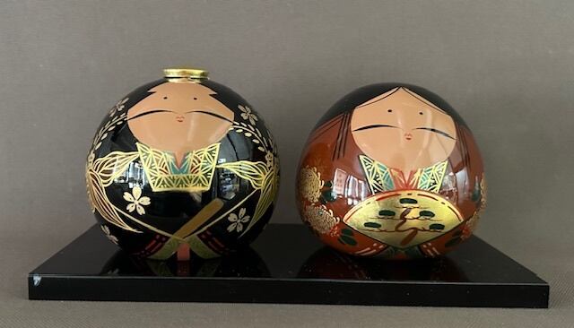 漆塗り純金箔・金粉で仕上げた丸型を基本にした男女1対のお人形で桐箱入です。