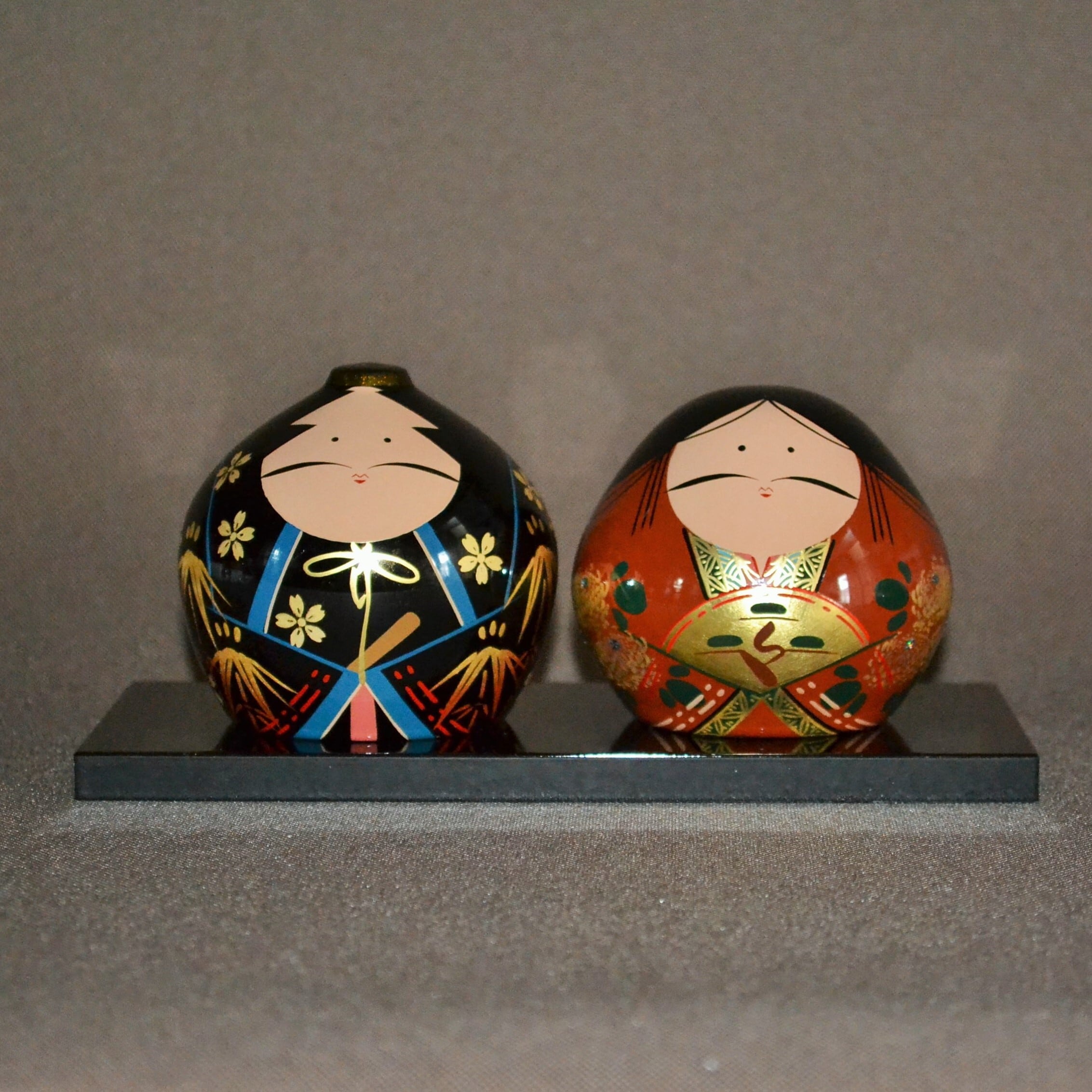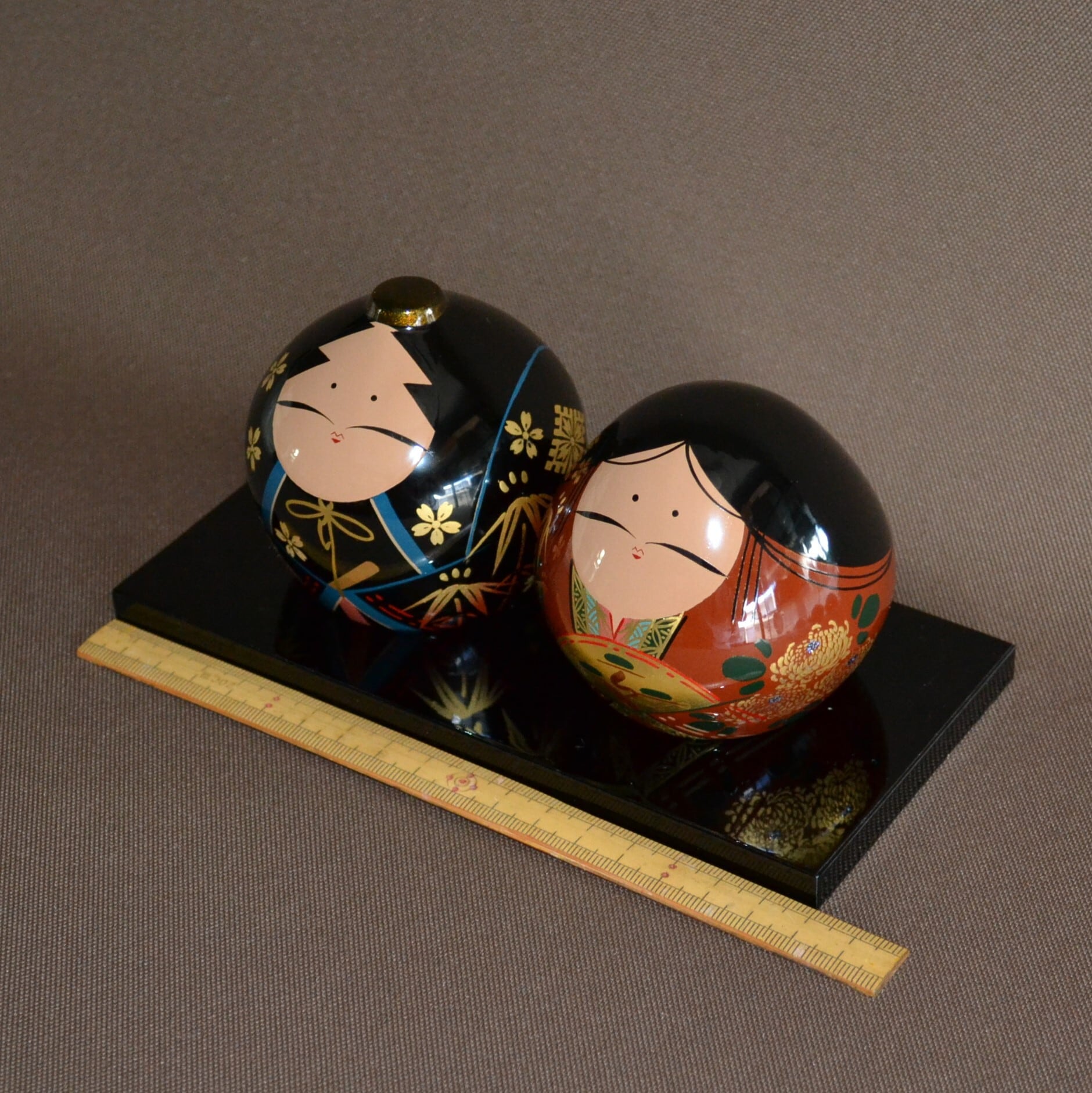 漆塗り純金箔・金粉で仕上げた丸型を基本にした男女1対のお人形で桐箱入です。