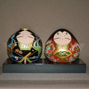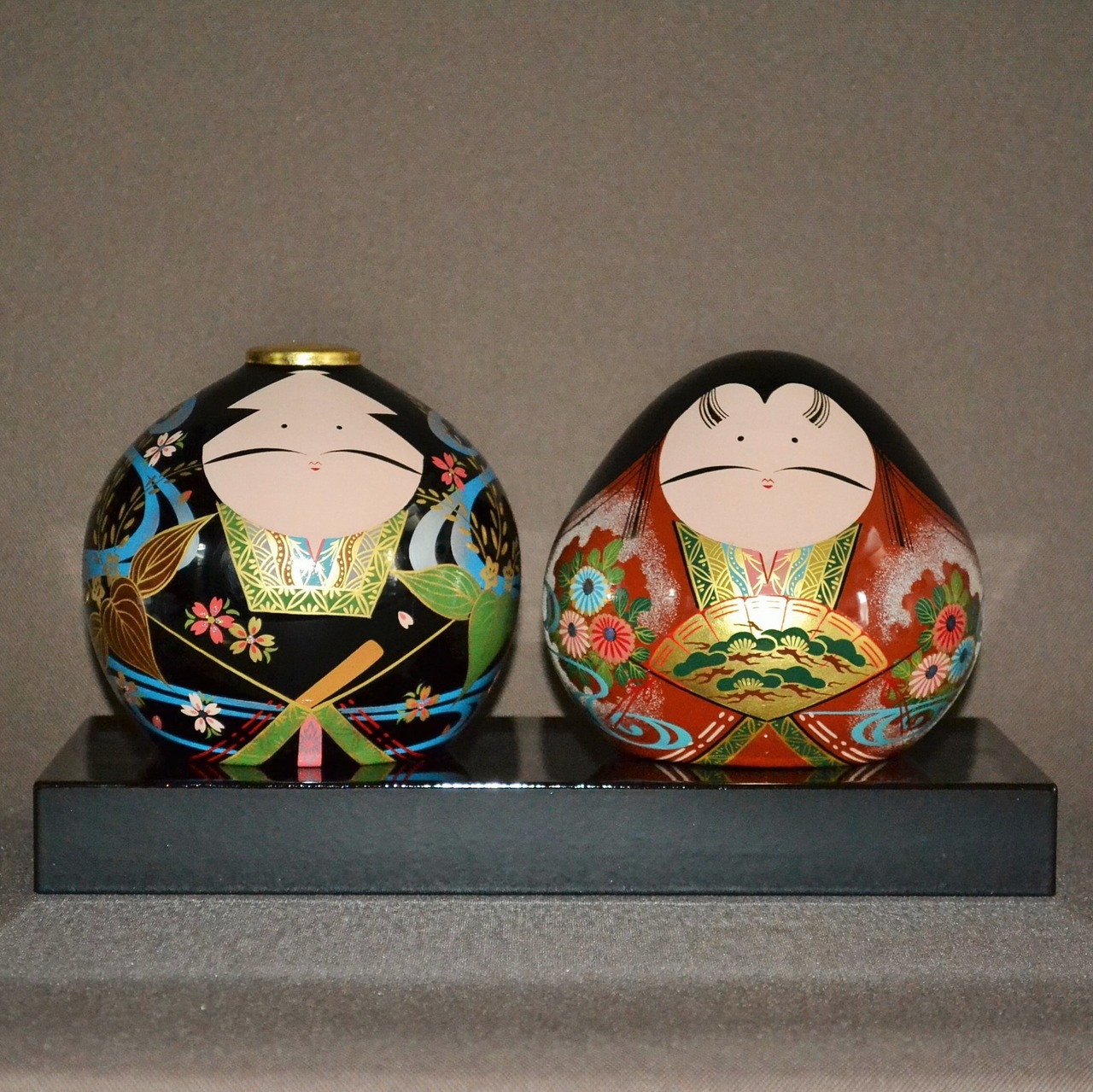 漆塗り純金箔・金粉で仕上げた丸型を基本にした男女1対のお人形で桐箱入です。
