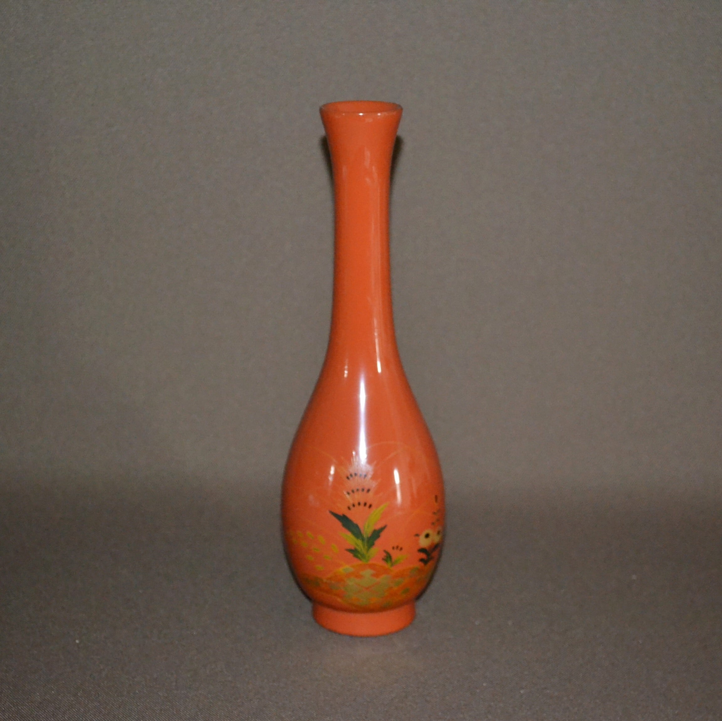 西の京都とうたわれた昔を今に伝える大内塗漆器は、渋い大内朱に優雅な秋草と大内菱を中心に純金箔をちりばめた霞が美しく調和して、独特の風情を醸し出しております鶴首花器(直径7.5cm高さ23.5cm)で桐箱入です。