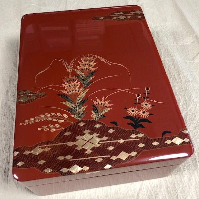 西の京都とうたわれた昔を今に伝える大内塗漆器は、渋い大内朱に優雅な秋草と大内菱を中心に純金箔をちりばめた霞が美しく調和して、独特の風情を醸し出しております甲高文庫・金蒔絵 印籠蓋(つき合わせ)は金蒔絵仕上げ(縦34.0Cm幅25cm高さ12.3cm)で桐箱入です。