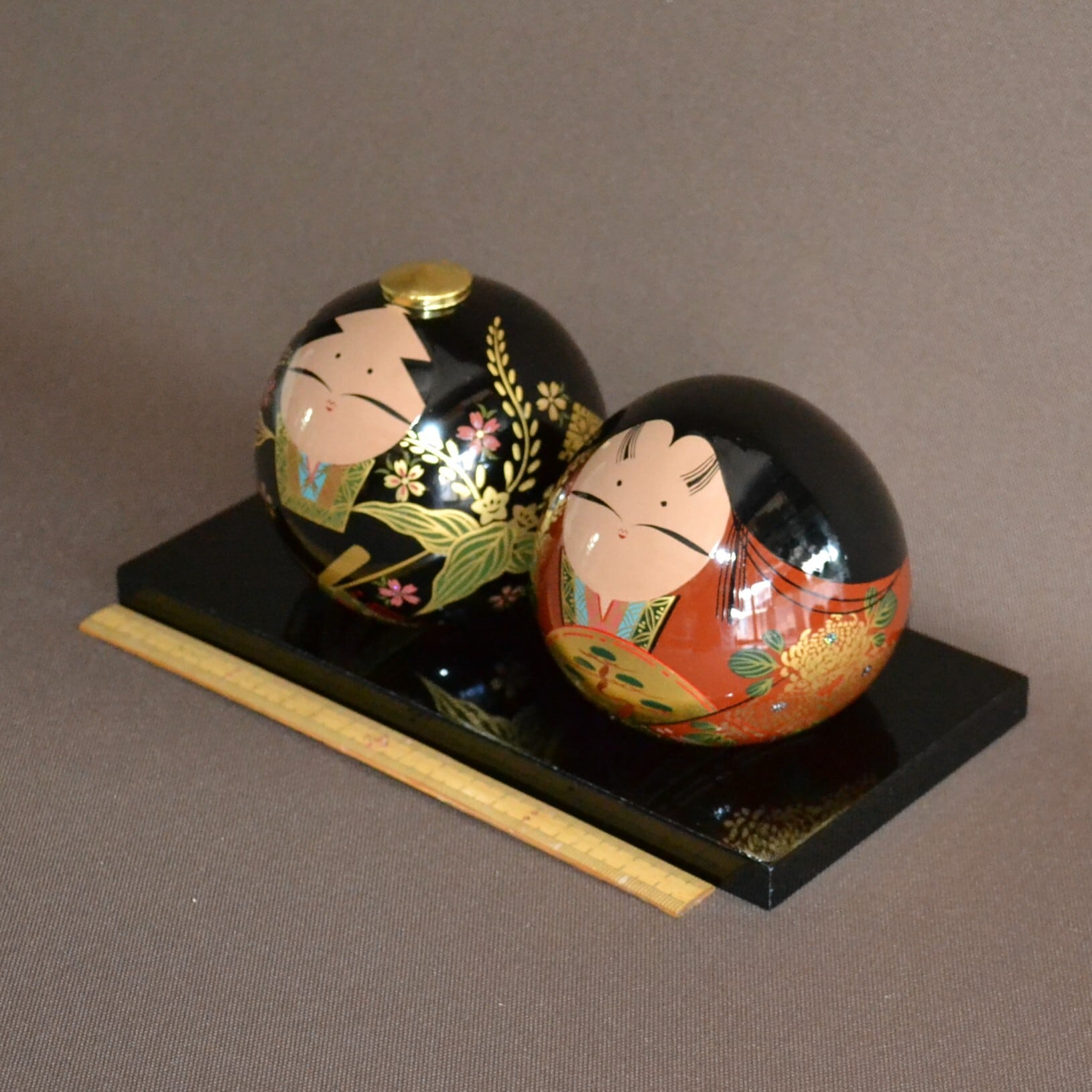 漆塗り純金箔・金粉で仕上げた丸型を基本にした男女1対のお人形で桐箱入です。
